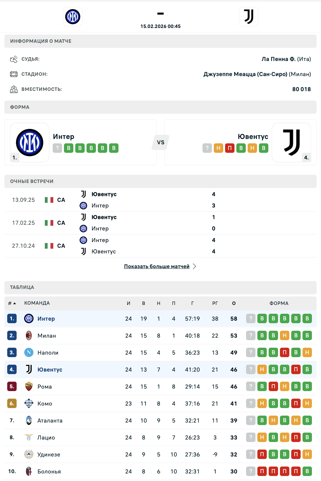 Ночью 15 февраля в Милане состоится матч 25-го тура Серии А - "Интер" примет "Ювентус".