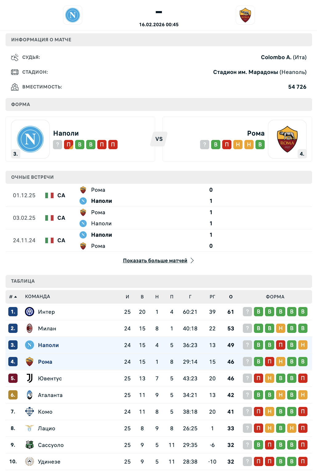 16 февраля в Неаполе состоится матч 25-го тура Серии А - "Наполи" примет "Рому".