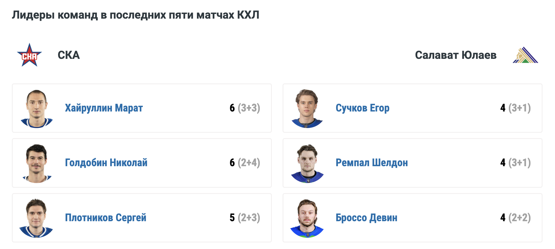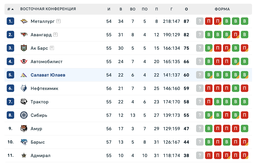 В таблице Западной конференции СКА занимает восьмое место, имея на два очка больше, чем "Салават Юлаев" в Восточной.